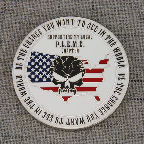 The Punisher L.E.M.C challenge coins feature with scared head skull on white background and “SUPPORTING” words around the edge represents the support to its members.